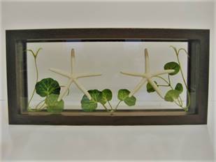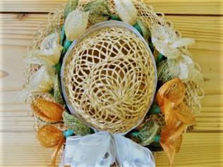 貝殻、ヒトデ、ウニ殻、サンゴ、流木、木の実、ミニ帽子、ミニ鉢、麻生地、自然な色や形、質感を活かし、優しさや温かみを感じさせるデザインに仕上げました。